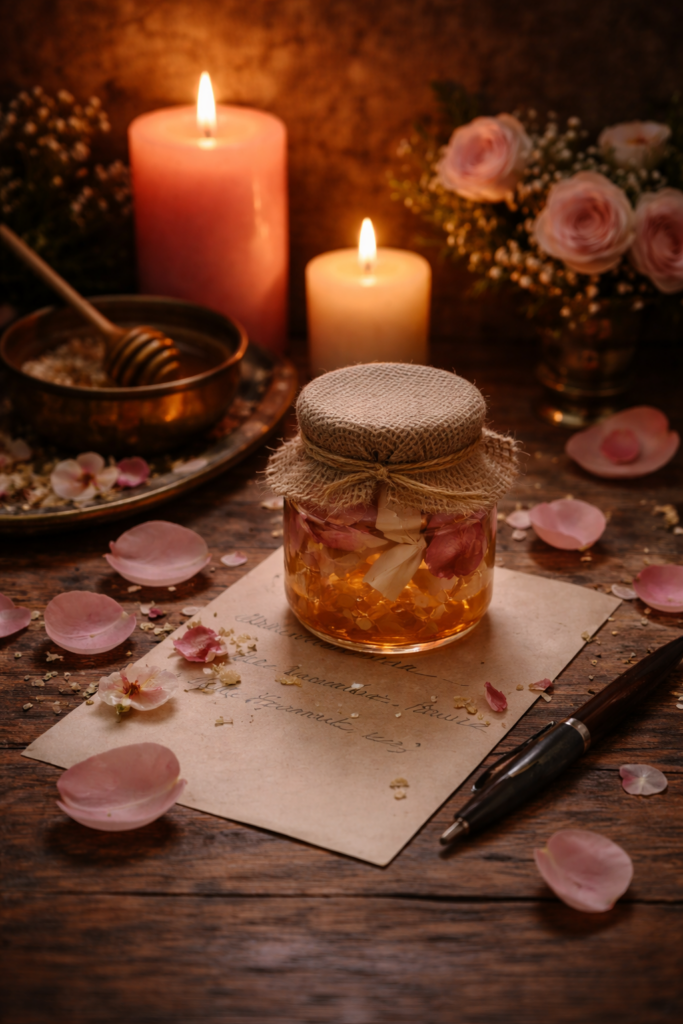 Dobla el papel hacia ti (para atraer dulzura) y colócalo dentro del frasco. Cubre con miel o azúcar moreno hasta que quede bien impregnado. Añade algunos pétalos de rosa o flores secas mientras visualizas la relación más suave, con sonrisas y palabras amables.